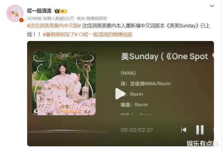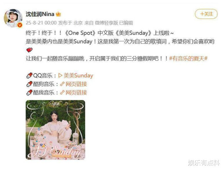 8月20日零点,这个心愿真的被实现了——由沈佳润亲自填词并演唱的中文版《美美 Sunday》正式上线。上线的瞬间,评论区被网友的调侃刷屏:“她爹小沈阳这下总算可以唱词了!”